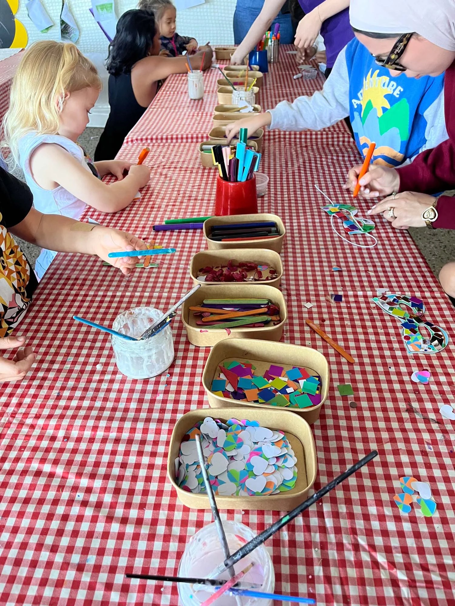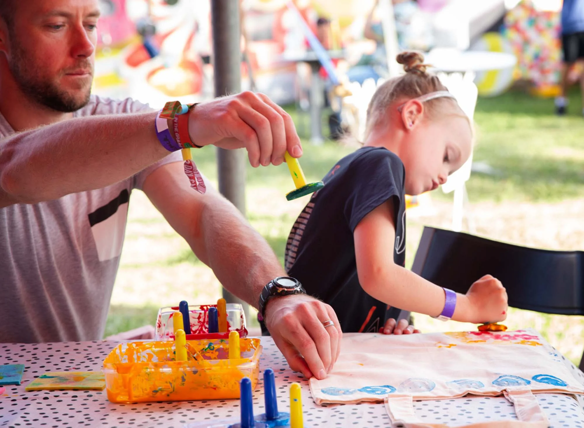 The heart of the activation, featuring drawing and colouring tables, painting zones, collage stations and recycled craft projects. Kids got hands-on with activities like mask making, pet rocks, paddle pop constructions, spoon puppets, loom bands, hama beads and wool crafts.